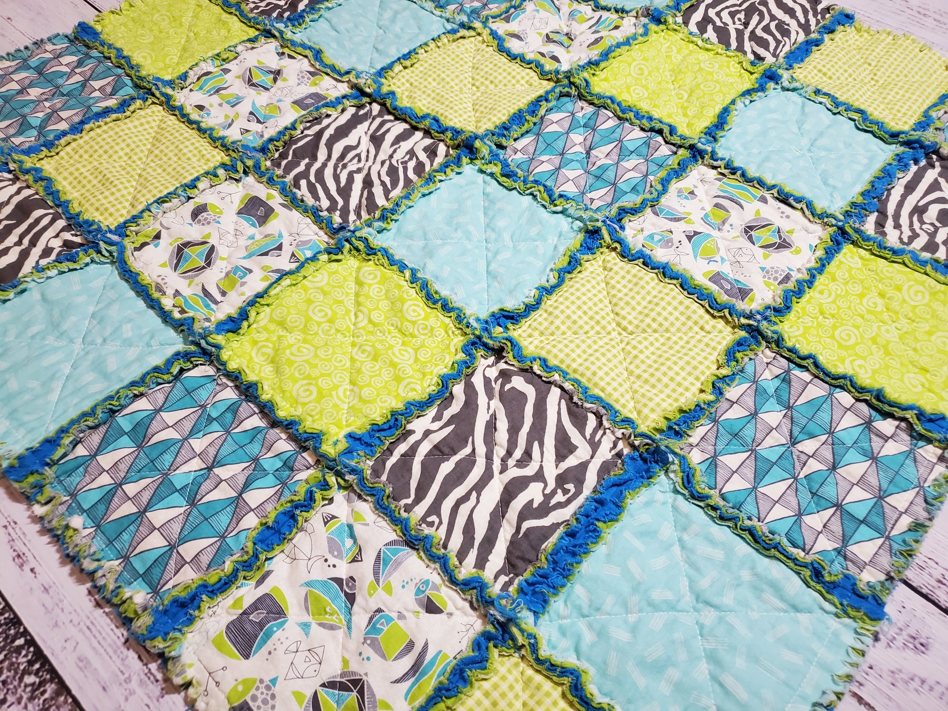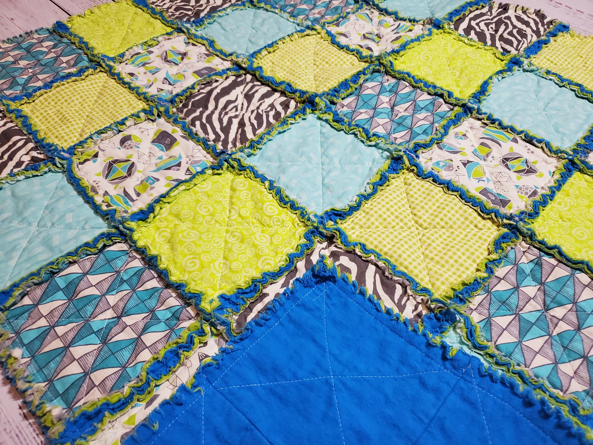 Measures approximately 36"×36" the perfect size for baby, toddler as a throw quilt, or tummy time mat or in carseat or stroller! Has been washed and dried to start the ragging process will get softer and raggier with each wash!