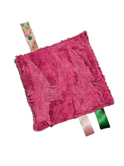 These paci holders are also a mini lovey which measures approximately 8" square with designer fabric on one side, and backed in a super soft faux fur minky. It also has two silky ribbon loops and a snap attachment that can be used with your baby's favorite pacifier or teether!