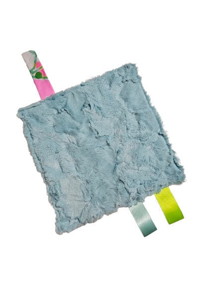 These paci holders are also a mini lovey which measures approximately 8" square with designer fabric on one side, and backed in a super soft faux fur minky. It also has two silky ribbon loops and a snap attachment that can be used with your baby's favorite pacifier or teether!