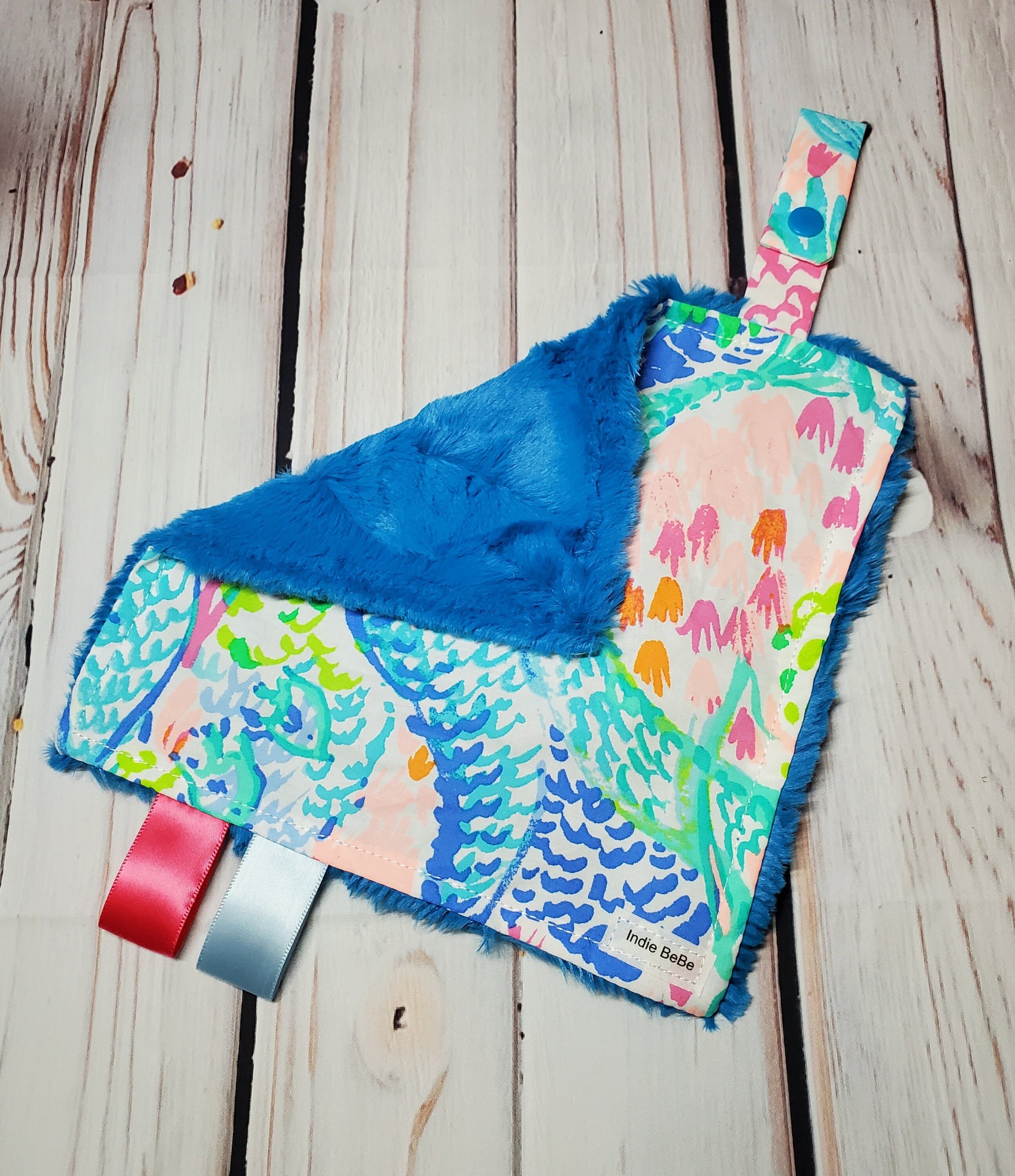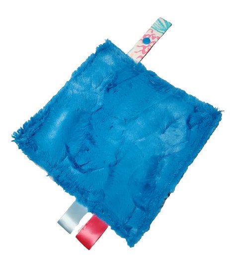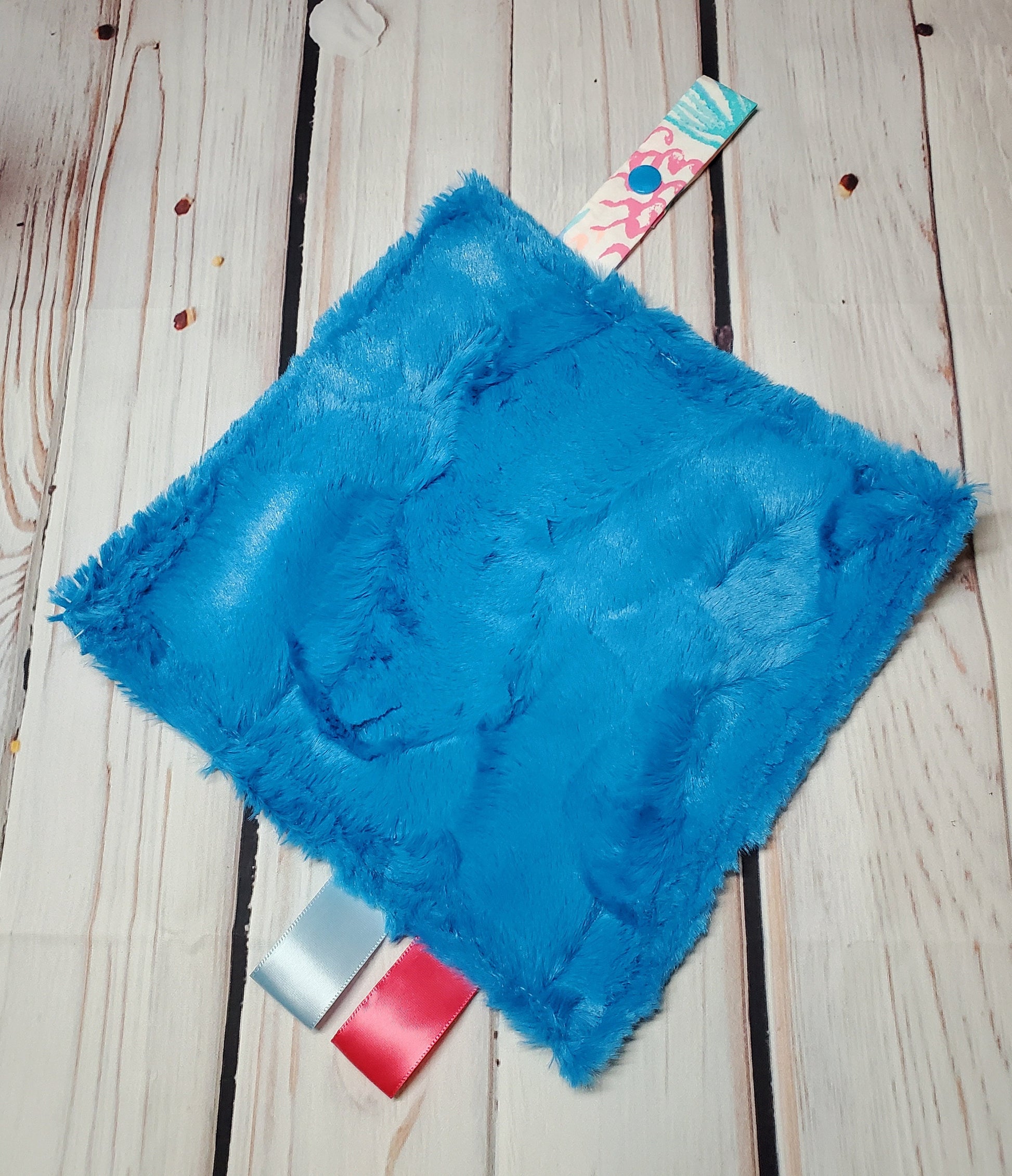 These paci holders are also a mini lovey which measures approximately 8" square with designer fabric on one side, and backed in a super soft faux fur minky. It also has two silky ribbon loops and a snap attachment that can be used with your baby's favorite pacifier or teether!