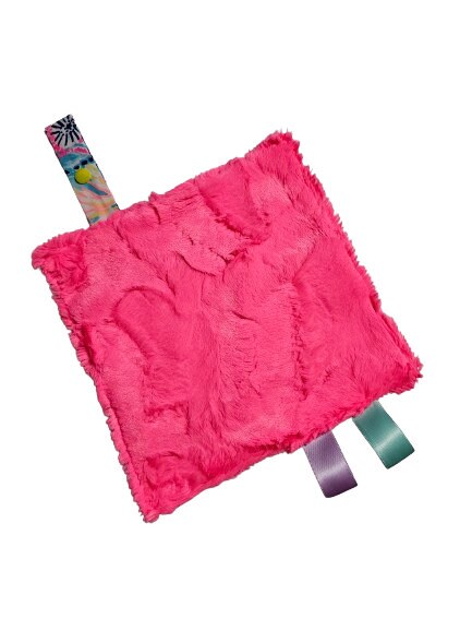These paci holders are also a mini lovey which measures approximately 8" square with designer fabric on one side, and backed in a super soft faux fur minky. It also has two silky ribbon loops and a snap attachment that can be used with your baby's favorite pacifier or teether!