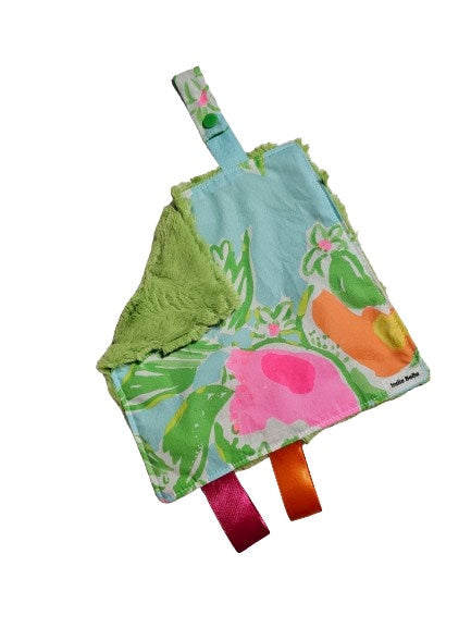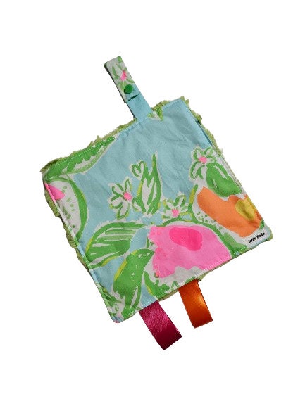 These paci holders are also a mini lovey which measures approximately 8" square with designer fabric on one side, and backed in a super soft faux fur minky. It also has two silky ribbon loops and a snap attachment that can be used with your baby's favorite pacifier or teether!