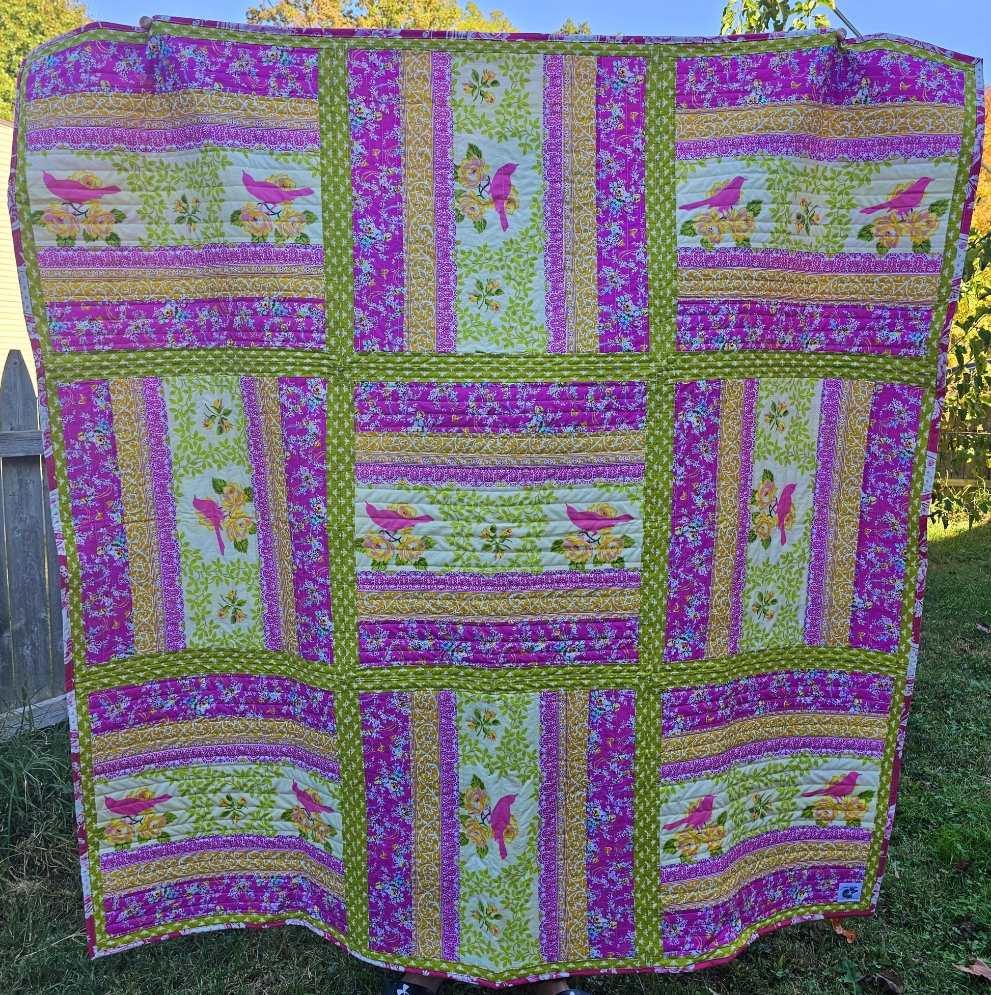 Brand new handmade by me, quilt featuring the out of print and hard to find Jennifer Paganelli and Heather Bailey fabrics in a fun pattern of strips. Backing is a yellow and pink cotton fabric also by Jennifer Paganelli with quilting done in white thread. It has been washed and dried once to give it the crinkle quilt look. Measures approximately 65”X65”