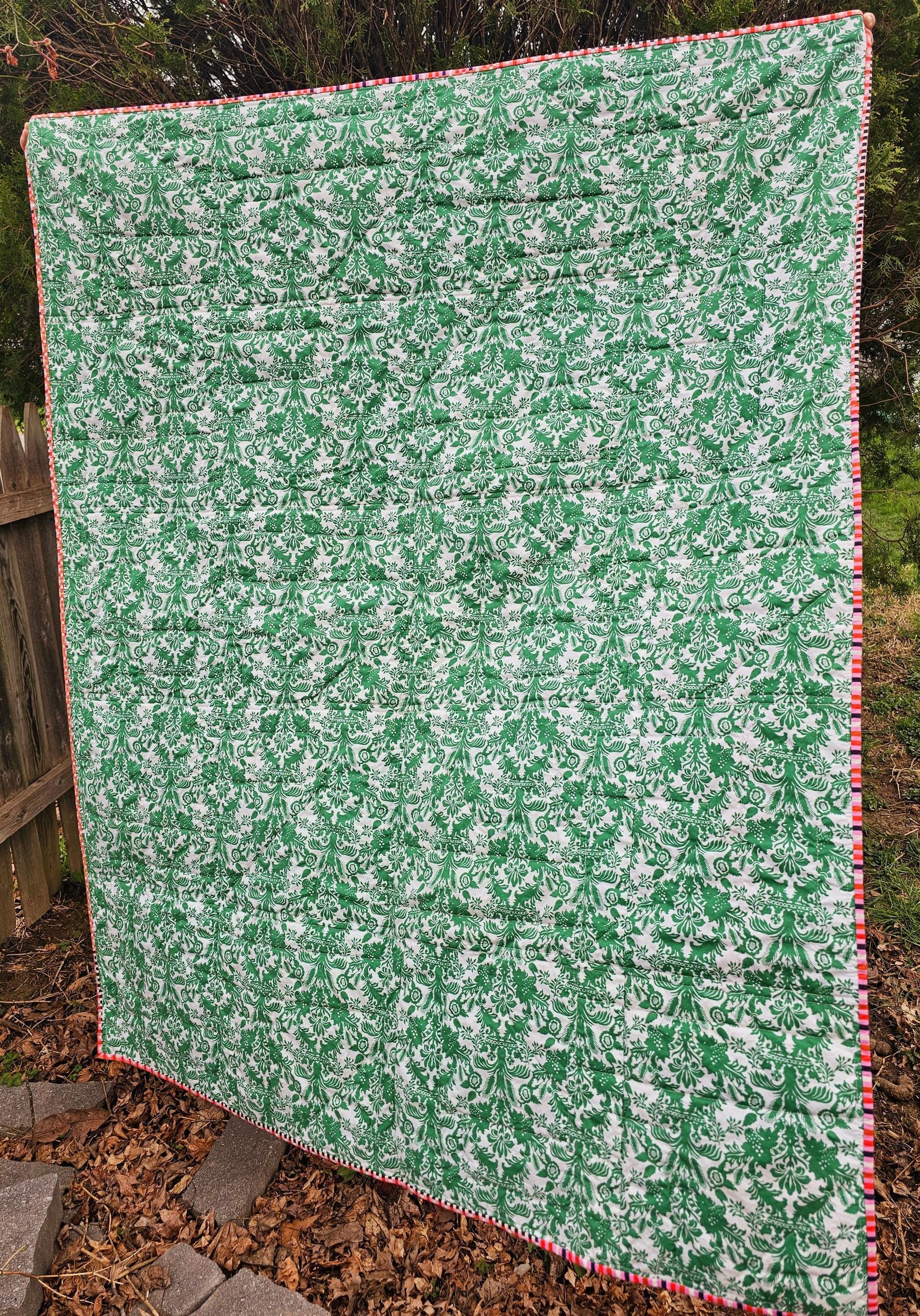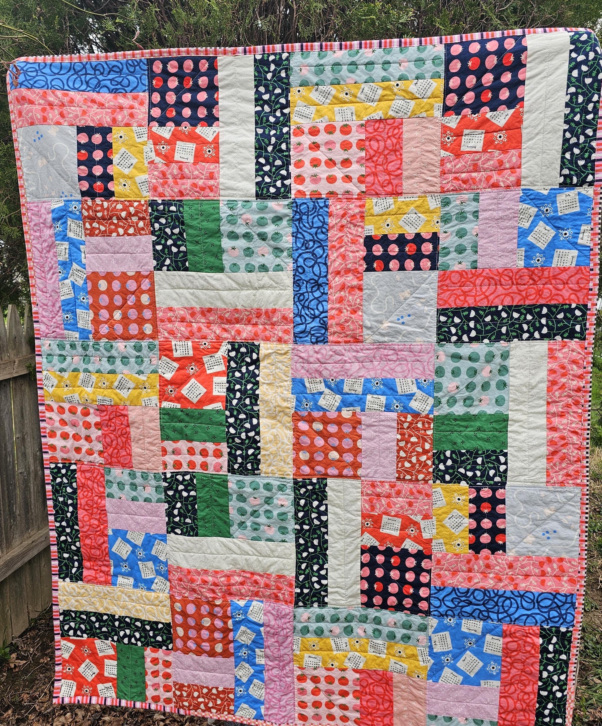 Brand new handmade by me, quilt featuring out of print Ruby Star Society Tomato Tomahto fabrics in a fun pattern i designed. Backing is a green and white fabric by Jennifer Paganelli and quilting done in white thread. It has been washed and dried once to give it the crinkle quilt look. Measures approximately 48”X59”