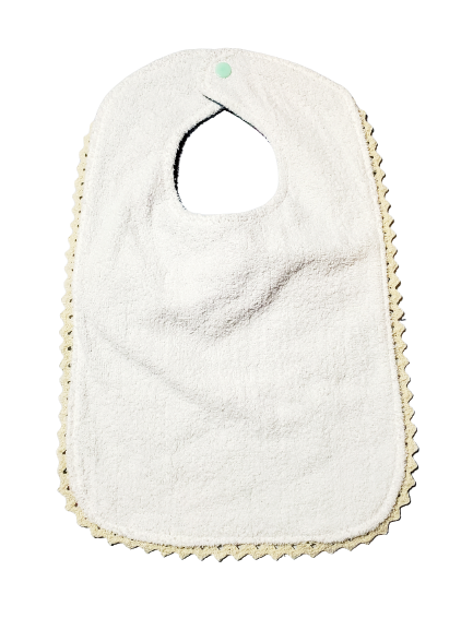 This baby bib is a one of a kind and makes a statement on any baby! Pretty floral cotton fabric on the front, white terry cloth on the back and edge with a vintage style natural cream lace.