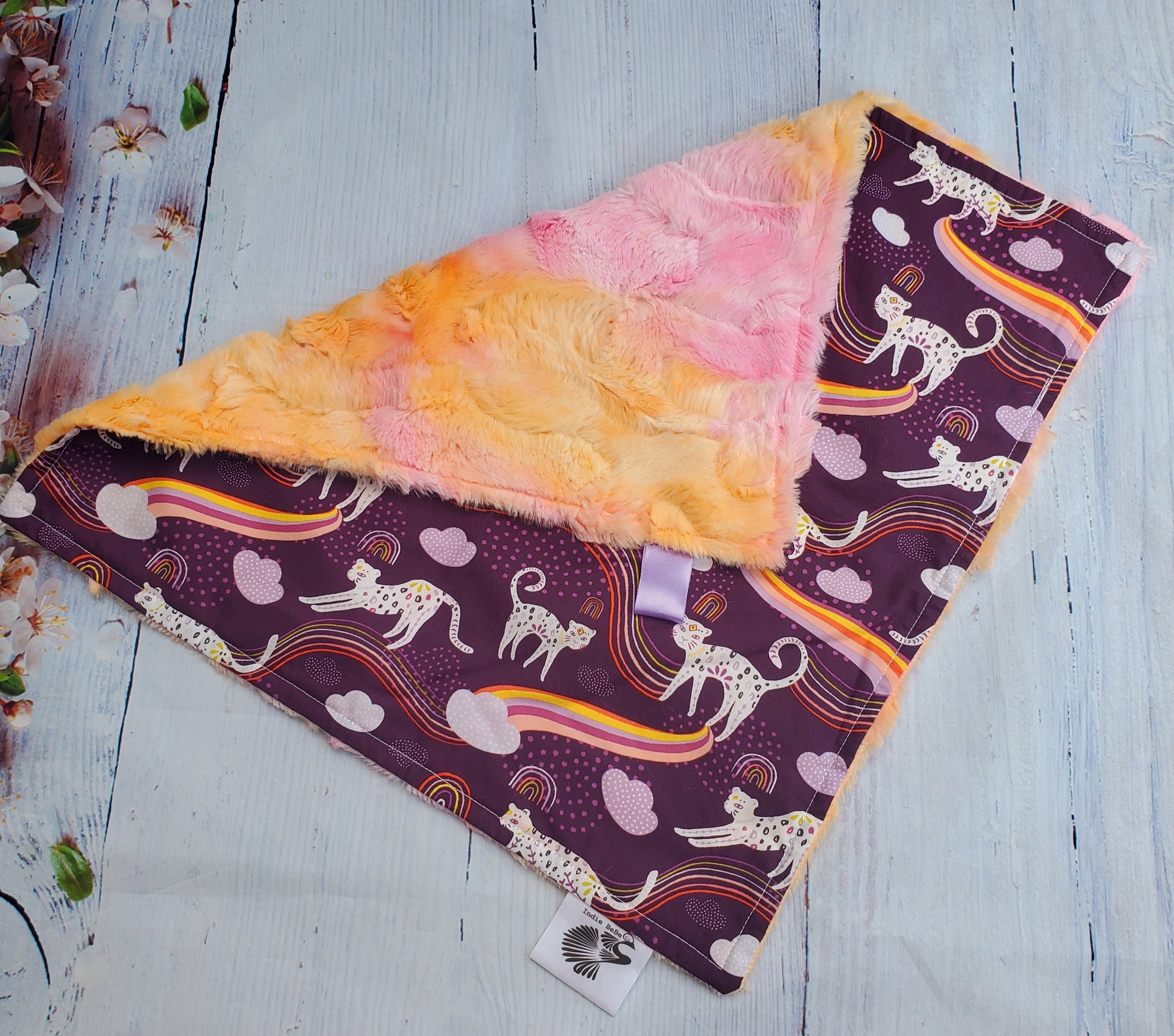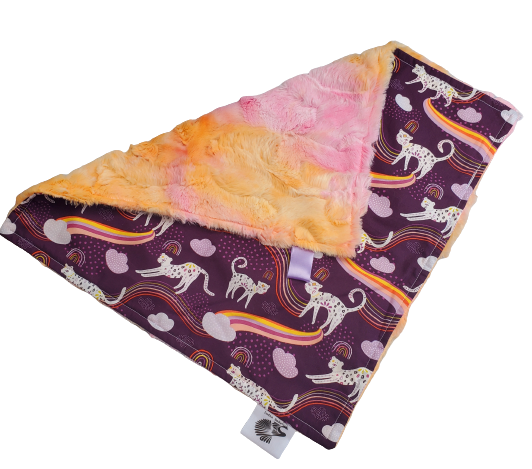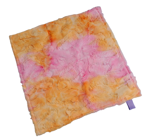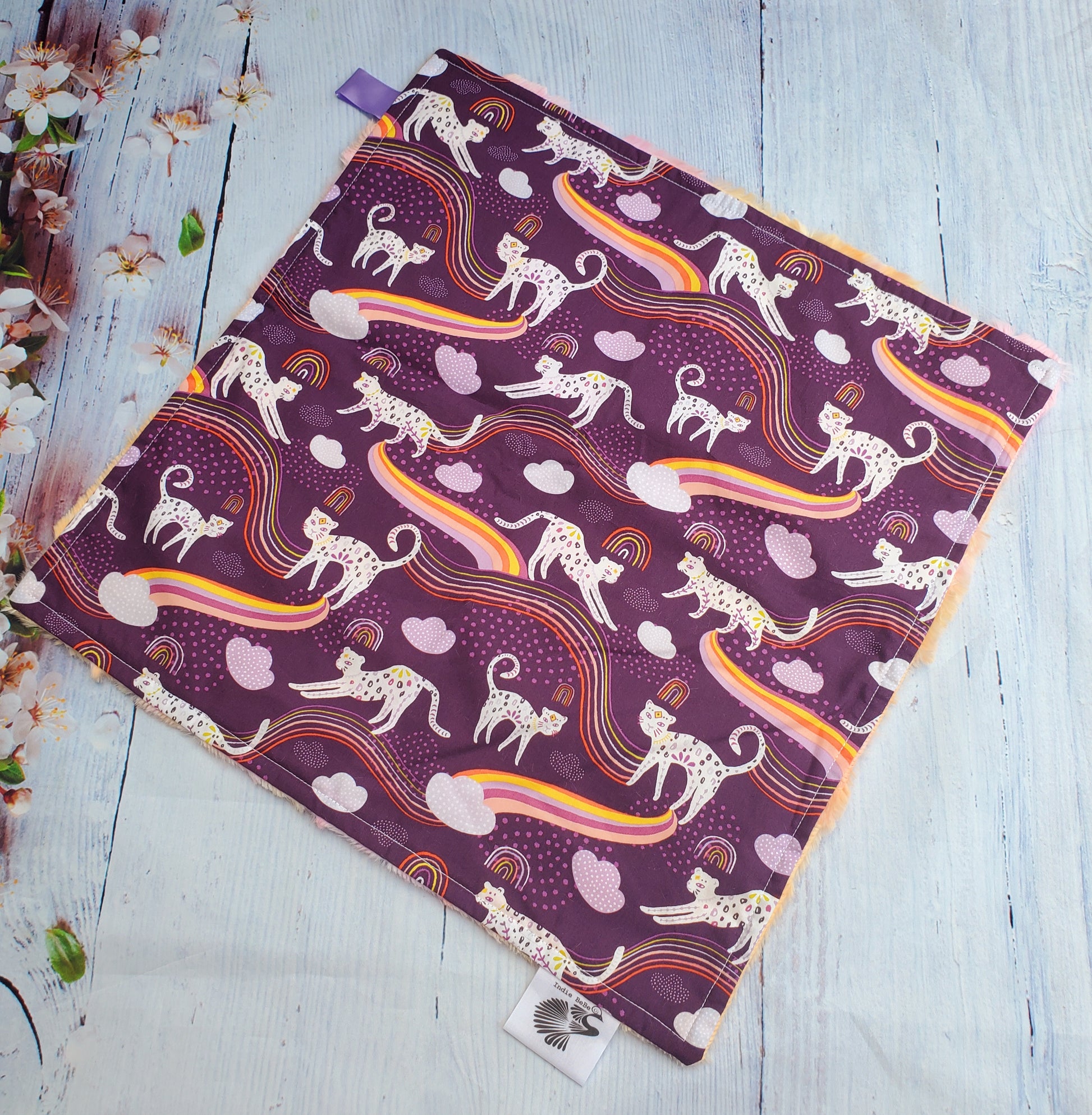 These new lovies feature a deluxe minky fur that is by far the softest and most luxurious to be found! The front is a designer cotton fabric that is sure to catch the eye of your little one and help to entertain. A satin ribbon loop is securely attached by being stitched multiple times to make sure it will not move, as is the label. Measuring approximately 17"×17" it is the perfect size for baby or toddler to bring anywhere!