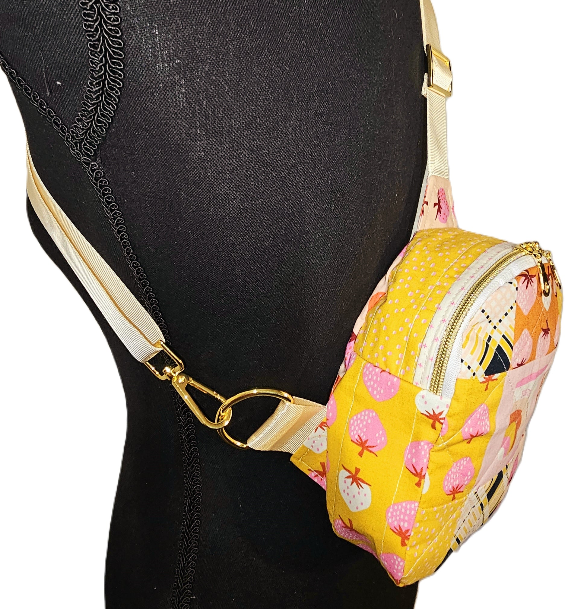 The exterior is a combination of patchwork fabrics by Ruby Star Society as is the lining. There is two zipper pulls on the zipper. And the adjustable strap can be attached to either side of the bag so it can be worn on either shoulder. Sturdy and comfortable to wear. The adjustable, removable strap extends approximately 48 inches.