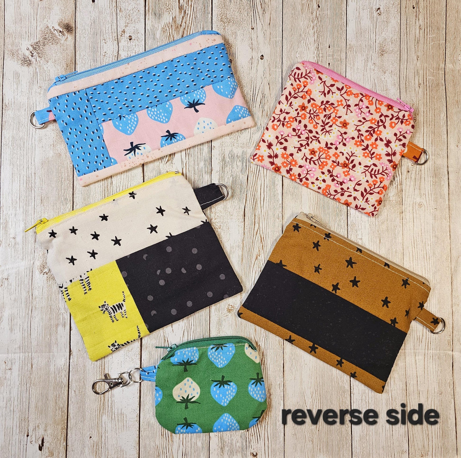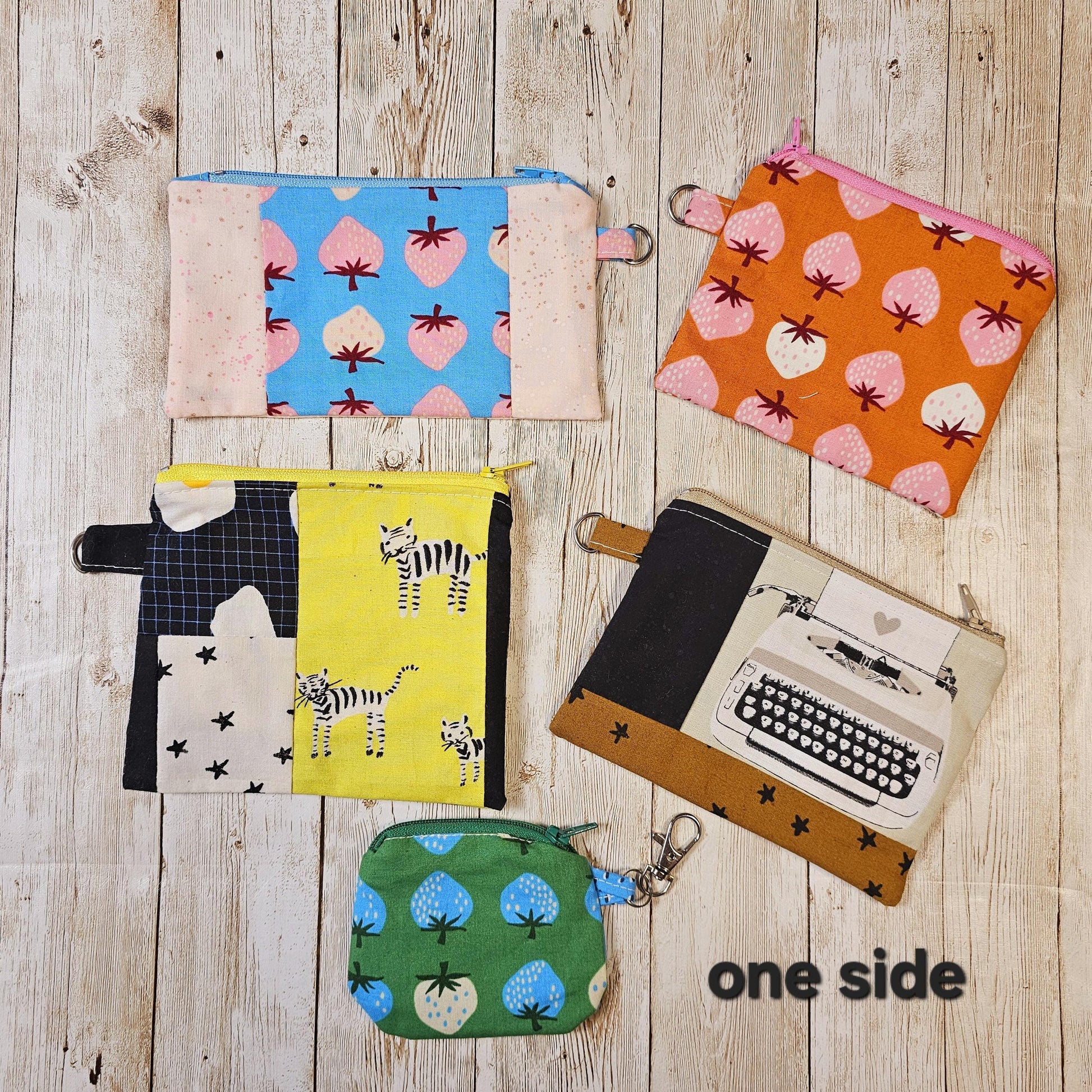 They're constructed from 100% cotton fabric, that features various fabrics. They are fully lined with 100% cotton and concealed seams and finish with a loop tab and D ring so to you can attach to a key ring or keyfob